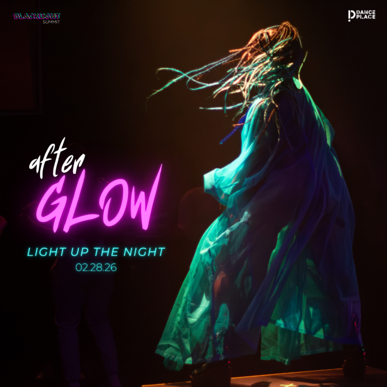 Image description: A performer in a mesh overcoat stands on stage, illuminated by a spotlight. afterGLOW appears on the left side, in white and neon lettering. Blue neon letters read “Light Up The Night” with the date February 28, 2026. BlackLight Summit and Dance Place’s logos appear in the left and right top corners, respectively.