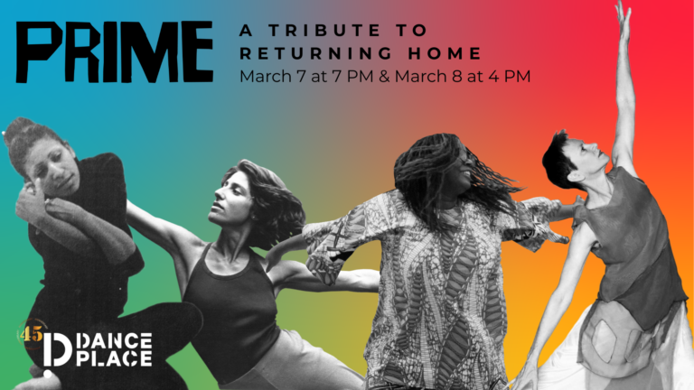 Image description: A vibrant purple background features “PRIME: A TRIBUTE TO RETURNING HOME” in large, gold, stylized lettering. Four figures, in various dynamic dance poses, are superimposed over the background. The figures are diverse in ethnicity and age and appear to be engaged in expressive dance movements. The image promotes Dance Place’s 45th Season, framed by “HOME IS COMING” text.